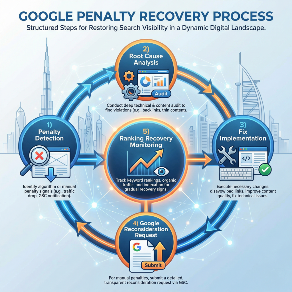 Google Penalty Recovery Dubai: How to Restore Lost Rankings addresses an important dimension of Google penalty recovery for Dubai businesses. RankUp UAE has successfully recovered dozens of UAE websites from both manual actions and algorithmic penalties, restoring organic traffic and rankings.